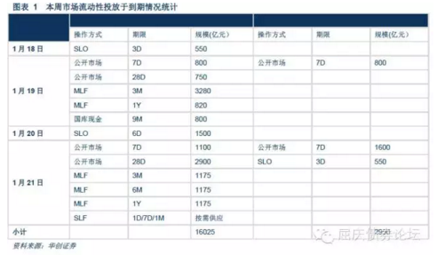 上周央行已通过逆回购、国库现金定存、MLF、SLO向市场投放资金16025亿元,除去当周到期的2400亿逆回购及550亿SLO操作,累计实现净投放13075亿元。其中7天以内到期资金1000亿元,28天跨春节资金3650亿元,3个月以上资金8425亿元。