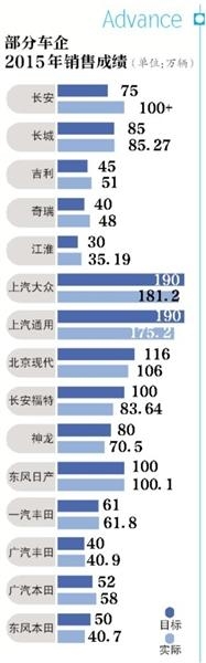 从单个企业来看,多数自主车企都实现了年初制定的销售目标,长安汽车更是超越众多合资品牌,在2015年产销双双实现突破100万辆,在乘用车销量排名中位列第五,而年初长安为自己设定的销售目标为75万辆。在SUV和新能源汽车两个细分市场的发力,让长安超额完成了销售任务。