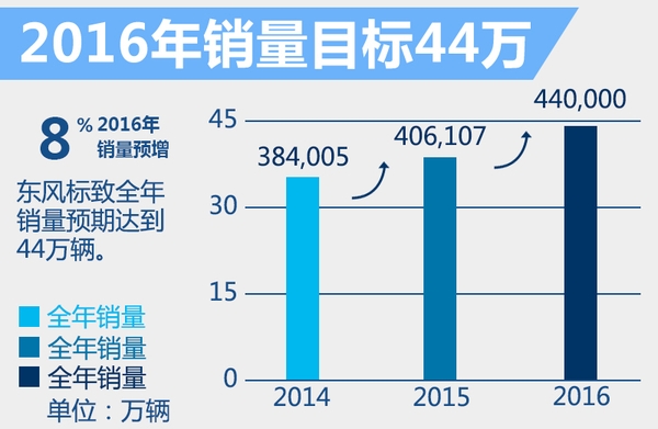 2015年东风标致整车销量为406,107辆,与2014年的384,005辆相比,增加2.2万辆,增长幅度达到了5.76%,增速位列合资品牌第四位。2016年,神龙汽车确立了77万辆的销量目标,其中东风标致品牌的销量目标44万辆。对比2015年东风标致全年销量可以看出,2016年东风标致全年销量预期增长8.4%。