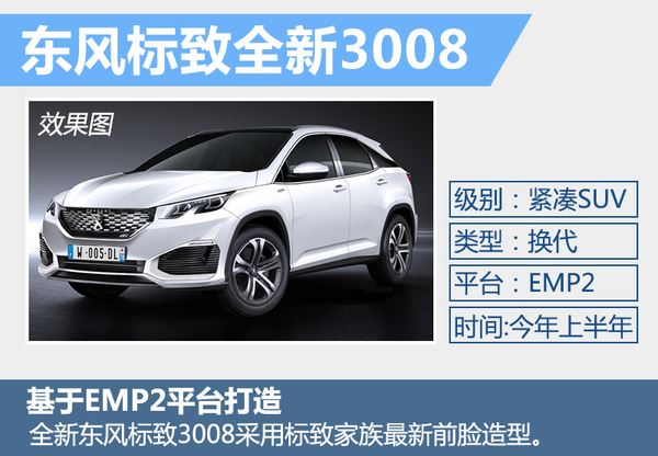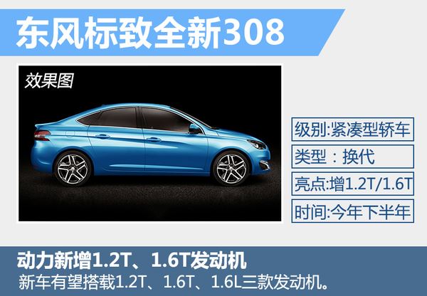 在2016年下半年,东风标致预计还将对在售紧凑级轿车标致308进行换代。这款车型是PSA(标致雪铁龙集团)上海研发中心本土开发的第一款车型,也是东风标致旗下的主力紧凑型三厢轿车。今年下半年这款车将迎来换代,新车同样将基于EMP2平台打造,车重将大幅减轻。动力方面,新车有望搭载1.2THP、1.6THP、1.6L CVVT三款发动机,动力更强劲,同时燃油经济性得到提升。