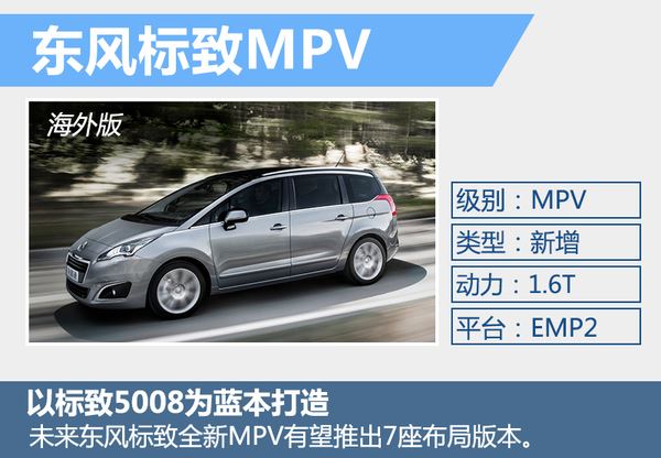 MPV领域,东风标致也将有所布局。标致目前在海外市场,有5008一款MPV车型,并分为5座版和7座版,未来东风标致将以海外版5008为基础打造MPV车型。新车定位家用MPV,并有望分别推出5座版和7座版车型,预计2016年底前问世,将弥补东风标致在MPV产品中的空白。(网通社 2016年1月26日北京报道)