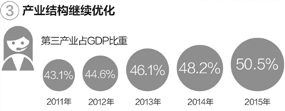 经济结构更优化。第三产业比重已达50.5%,比第二产业高10个百分点,产业结构更加优化;最终消费对GDP的贡献率达60%以上,需求结构持续改善;恩格尔系数从2014年的31%进一步下降到2015年的30.6%,居民消费结构也在升级。