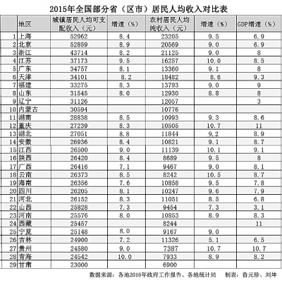截至28日记者发稿时,共有29省(区市)通过政府工作报告或由统计部门公布了当地2015年居民收入指标。城镇居民人均可支配收入前十名分别为上海、北京、浙江、江苏、广东、天津、福建、山东、辽宁、内蒙古,与2014年的前十名保持一致。在经济增长率6.9%的情况下,21省(区市)的城镇居民收入保持了8%(含8%)以上的增速,18省(区市)的农村居民人均收入保持了9%以上(含9%)的增速。