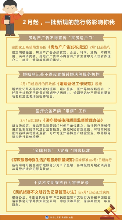 新华社北京1月31日电(记者白阳)这个2月,中国老百姓好事连连。除了农历新年即将来临,一批与民生息息相关的新规也将在本月施行。