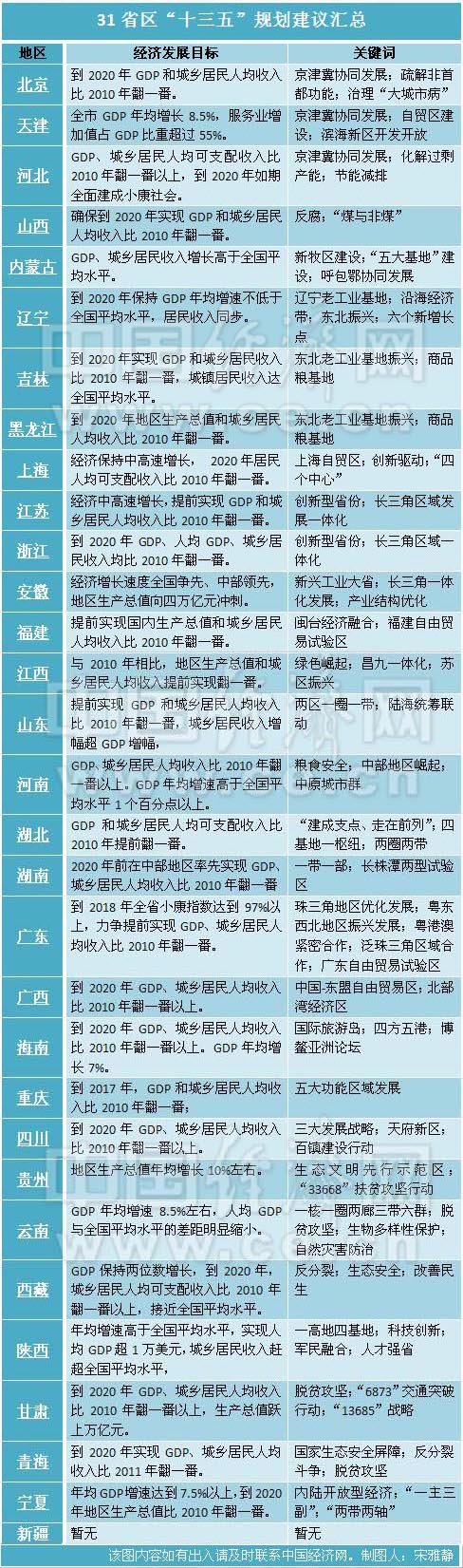 北京2月3日讯(记者宋雅静)2016年是“十三五”的启航之年,目前30省区市“十三五”规划建议已发布,近乎全部地区都将城乡居民人均可支配收入在“十三五”期间实现翻番作为经济建设发展的目标之一。