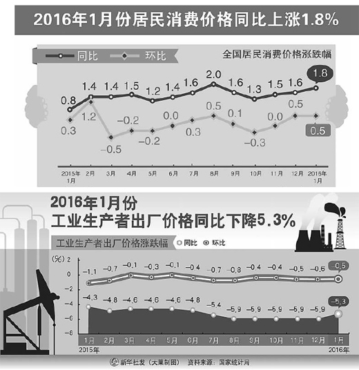 国家统计局2月18日发布的1月份全国居民消费价格指数(CPI)和工业生产者出厂价格指数(PPI)数据显示,CPI环比上涨0.5%,同比上涨1.8%,同比涨幅创下去年9月以来的新高;PPI环比下降0.5%,同比下降5.3%。尽管PPI连续47个月下滑,但环比、同比降幅双收窄,释放积极信号。