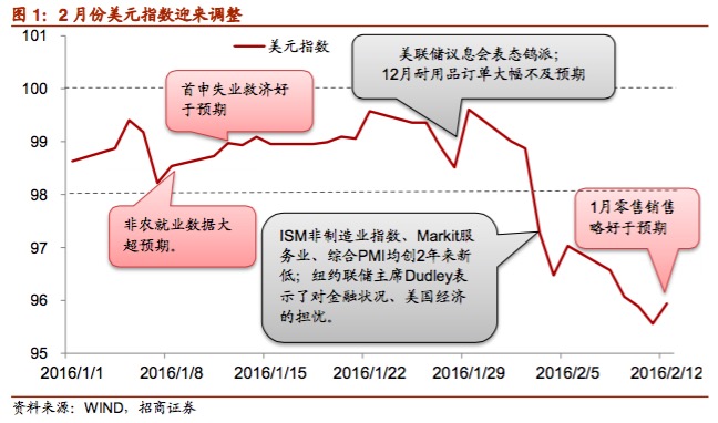 2016 年以来的经济数据显示美国制造业、非制造业均现疲态,就业依然强劲,但通胀预期有所缓和,在全球金融市场动荡、实体经济需求不足的背景下,美元指数对经济数据的反馈体现为易下难上,波动区间由(98,100)下移至(95,97)。