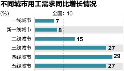 从智联招聘不同城市用工需求同比数据来看,三线及三线以下城市人才需求旺盛,2015年第四季度的在线招聘职位数均比上年同期增加了27%以上,主要集中在基金/证券/期货/投资,交通/运输等行业上。新一线和一线城市的增长幅度分别为8%及7%,保持平稳且放缓的增长趋势。
