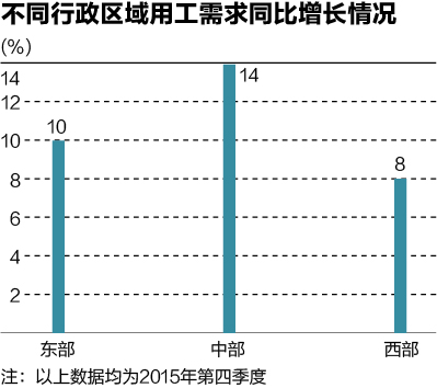 2015年第四季度劳动力市场继续保持供不应求的格局,但就业景气程度不容乐观。从地区看,中部地区2015年第四季度在线招聘职位数同比增加了14%,幅度超过全国平均增速(10%),及东部的10%和西部的8%。中部地区的增长幅度最高,这一增长得益于中部区域经济的快速发展加快了对于人才数量的需求。