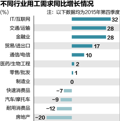 2015年第四季度,快消、汽车/摩托车、耐用消费品等行业的用工需求首次出现负增长,分别为-7%、-9%和-12%,房地产业依然延续了负增长趋势。