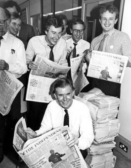 1986年,创始人安德斯·维塔·史密斯(坐)在办公室庆祝《独立报》诞生。资料图片