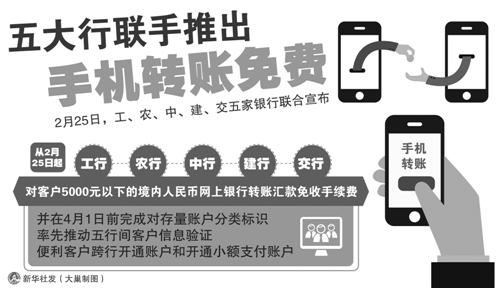 2月25日,工、农、中、建、交五大银行联合推出惠民措施,实施手机银行转账免费。同时,5家银行在北京联合签署协议,宣布落实中国人民银行账户管理新政策,在4月1日前完成对存量账户的Ⅰ、Ⅱ、Ⅲ类户区分标识。同时,就客户跨银行账户服务开展合作,将率先在五大行间开展客户银行账户信息验证,以提升客户“跨行在线开立账户”的便捷性。