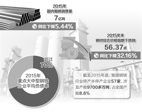 随着经济下行压力加大,钢铁业产能过剩矛盾日益凸显,企业生产经营困难加剧,出现了行业性亏损。2015年,国内粗钢消费量7亿吨,同比下降5.44%;钢材综合价格指数2015年末下跌到56.37点,同比下降32.16%;钢协会员企业实现利润总额为亏损645亿元,亏损面50.5%,同比加大33.67%。