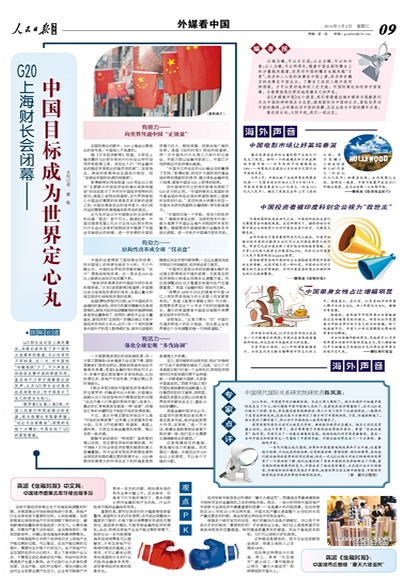 G20财长会议在上海闭幕后,本报记者浏览了多个国际主流媒体的报道,与以往有所不同的是,这一次,对中国的“冷嘲热讽”少了,不少声音反而纷纷点赞中国的积极作用。甚至有不少西方观察家主动发声,认为G20财长会议虽未达成有效协议,但中国显示了自己的担当与信心。