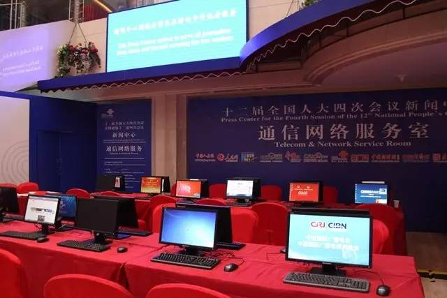 一层大厅的通信网络服务室为中外记者提供免费上网、稿件查询和传输等服务,互联网接入速度约为每秒100兆。为方便记者上网,新闻中心的公共区域实现了无线网络全覆盖,记者在新闻中心采访发稿十分便利。