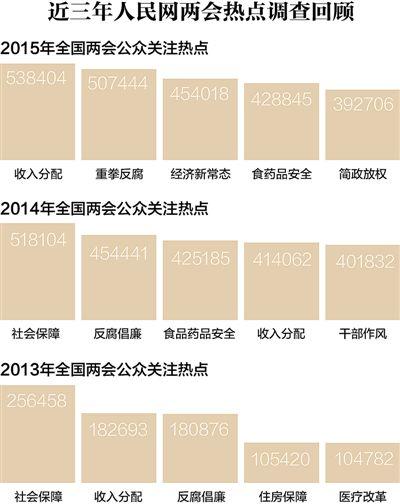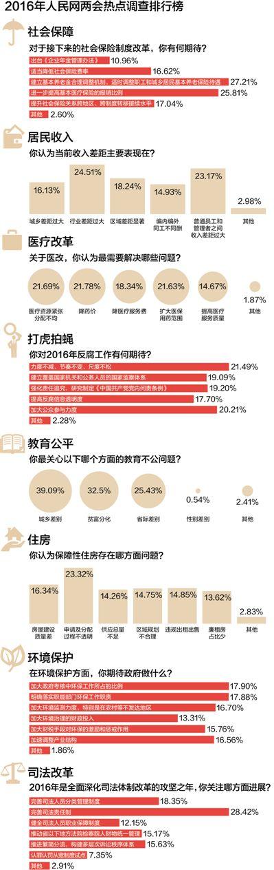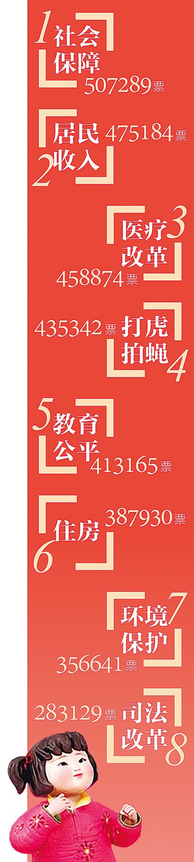 从今年2月15日开始,人民网第十五次推出两会热点问题调查。本次调查得到广大网民热烈响应,截至调查结束,参与网民超388万人次。本版选取得票数前八位的热点话题,与读者共同见证、参与、分享“我们的两会”。