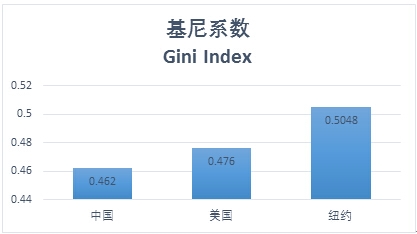 根据国家统计局2015年的数据显示,中国的基尼系数为0.462,已经连着7年下跌并达到了15年以来的最低点。而美国统计局(United States Census Bureau)公布的数据则显示美国的基尼系数比中国更高,为0.476,而纽约更达到了0.5048.