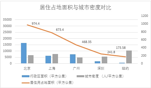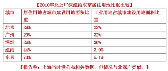 1、2010年,北京、广州和深圳的居住用地占城市建设用地面积的比重明显低于纽约、东京;而工业用地占比则大幅高于纽约、东京(数据见下)。上海没有公布相关数据,但情况与北深广应该类似