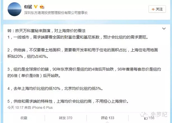 图1:网传的万科董秘对上海房价的看法
