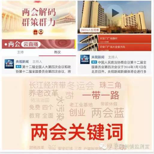 央视新闻在两会现场搭建云直播平台,进行全景式两会网络直播。如在微信菜单栏推出“自己当导播,任意切换多路画面”的“两会云直播”,以及借助大数据分析与LBS地理位置的“两会热搜”等全新栏目。在头图位置点击也能直接切入云直播平台,实现跨屏实时互动。