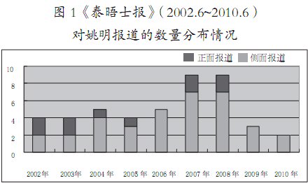 2002年6月至2010年6月,《泰晤士报》对姚明的报道共45篇。从对姚明的报道总量看,其运用系列报道的表现形态,内容涵盖各个方面。系列报道“不是单纯地去追踪和描述事件的发展过程,而是用深邃的眼光去深入解剖事物。系列报道在反映现实上具有较强的透视力,多用于报道一些具有一定深度、带有启示性和研讨性的问题”。据统计,这45篇报道都提到姚明,其中以姚明为正面报道对象的报道为10篇。