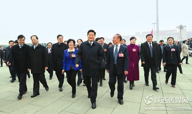 3月4日,十二届全国人大四次会议举行预备会议,图为陕西省代表走过天安门广场。