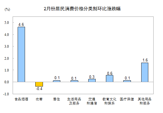 2月份,全国居民消费价格总水平环比上涨1.6%。其中,城市上涨1.6%,农村上涨1.6%;食品价格上涨6.7%,非食品价格上涨0.3%;消费品价格上涨2.2%,服务价格上涨0.5%。