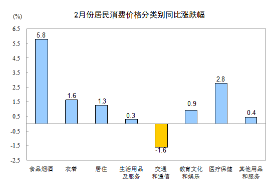 2月份,其他七大类价格同比六涨一降。其中,医疗保健、衣着、居住、教育文化和娱乐、其他用品和服务、生活用品及服务价格分别上涨2.8%、1.6%、1.3%、0.9%、0.4%、0.3%;交通和通信价格下降1.6%。