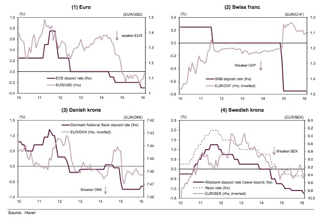 欧洲是开启负利率的首块“试验田”,从丹麦(-0.65%)、瑞典(-0.5%)、瑞士(0.75%)央行再到欧洲央行(-0.3%),货币政策在欧洲大陆可谓无所不用其极。