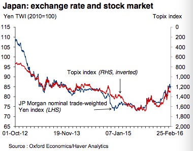 1月29日,即日本央行行长黑田东彦祭出负利率政策当天,日元一度贬值至121.67日元兑一美元,但这只是昙花一现。自2月1日起,日元便开始狂飙,到2月11日竟创下111.06日元兑一美元的新高,总计升值8.72%;而日股暴跌17%,几乎把日本首相安倍晋三过去三年促成日股大涨、日元贬值的努力全部抹去。