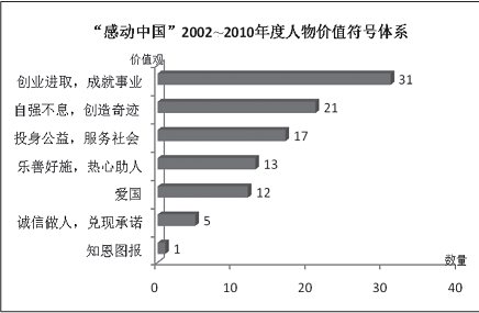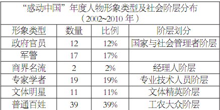 上表是笔者将2002~2010年度“感动中国”人物形象(含群体,共100名)按照形象身份和所属社会阶层做的类型化处理,并最终生成为7类价值符号(见图)。