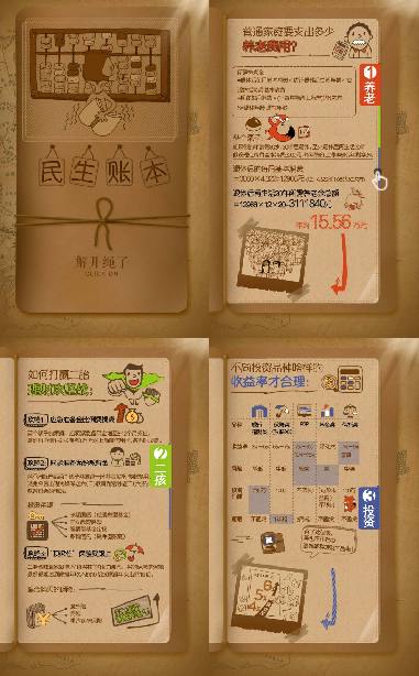 《两会民生账本》——解开绳子,打开账本,为未来可能的支出算一笔账吧。能把未来的账算到如此清楚易懂,像小编这种总为算数能力着急的人(面壁去)都能看明白,正兴奋,往后翻却发现原来这个账本要讲的重点并非算数,而是用数字说明生活成本,提倡大家理性投资,科学理财。账本最后还附上表格,告知大家不同投资类型啥样的收益率才合理,真是实用又贴心。看完这个H5之后,有没有觉得人生都有了紧迫感?奋斗吧少年!