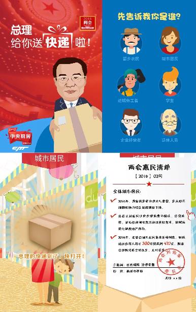 《你有一份来自总理的神秘快递》——啊?总理给咱送快递啦?“叮咚”门铃声响起,快出来看看!先选择角色,然后拆开包裹,总理送了啥?原来是“两会惠民清单”,仔细一看,两会最新惠民政策被清晰列出。总理虽然忙,但谁也没被落下。小编怀着期待的心情把所有包裹都拆开看了一遍:脱贫攻坚,促进就业,治理雾霾……顿时觉得生活咋那么美好,写稿儿都更有动力了呢!