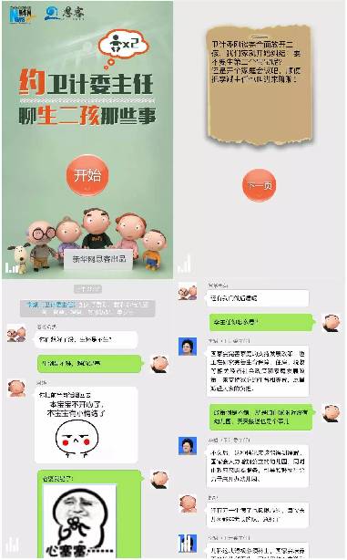 《约卫计委主任聊生二孩那些事》——把卫计委主任拉进聊天群共同探讨二孩话题,于是就有了如下的聊天记录。乍一看这个H5你可能会想,不过是套用了群聊场景,但如果连调侃和吐槽都被模拟出神一样的画风,这完全就是我们日常聊天的即视感。对!就是这么接地气!卫计委主任的解答减轻了咱关于生养二孩的顾虑,也介绍了国家实施“全面二孩”政策的相关配套措施,这种在聊天场景中了解政策的方式真是既轻松又愉快啊。