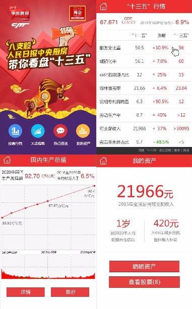 《涨了!人民日报中央厨房带你看盘“十三五”》——用“股票行情”和“大盘指数”走势图呈现“十三五”规划纲要(草案)中的关键信息,服务业比重和城镇化比重等多支“股票”一路飘红,2016至2020年GDP年均增速一路看涨。扫描指纹查看“我的资产”,到2020年人均预期寿命提高一岁;2016年城乡居民医保每人补助420元,是不是瞬间觉得很安心?