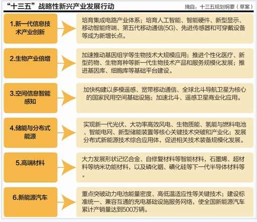与“十二五”相比,“十三五”规划纲要草案将战略性新兴产业的范围由节能环保、新一代信息技术、生物、高端装备制造、新能源、新材料、新能源汽车等七类调整为新一代信息技术产业创新、生物产业倍增、空间信息智能感知、储能与分布式能源、高端材料、新能源汽车六大领域实施战略性新兴产业发展行动详见图表.