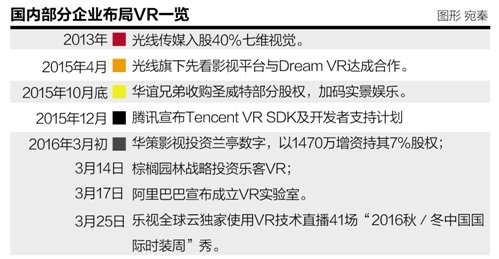 值得注意的是,BAT也扳下开往VR的道岔。3月17日,阿里巴巴宣布成立VR实验室,将发挥自家平台优势,同步推动VR内容培育和硬件孵化。而在去年12月,腾讯已经宣布Tencent VR SDK及开发者支持计划。百度视频也于当月推出VR频道。