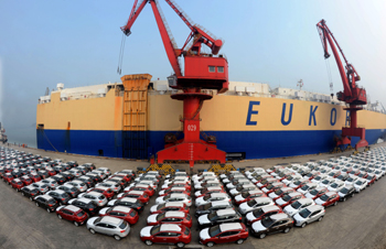 1月9日,由安徽江淮汽车股份有限公司生产的350台汽车在江苏连云港港码头装船出口巴西。 新华社发(王春摄)