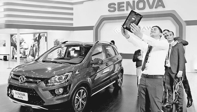 在第二十三届开罗国际车展上,埃及客商与北汽绅宝汽车自拍合影。本报记者 王云松摄