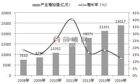 2008-2014年中国文化产业市场规模及增长率(单位:亿元,%)
