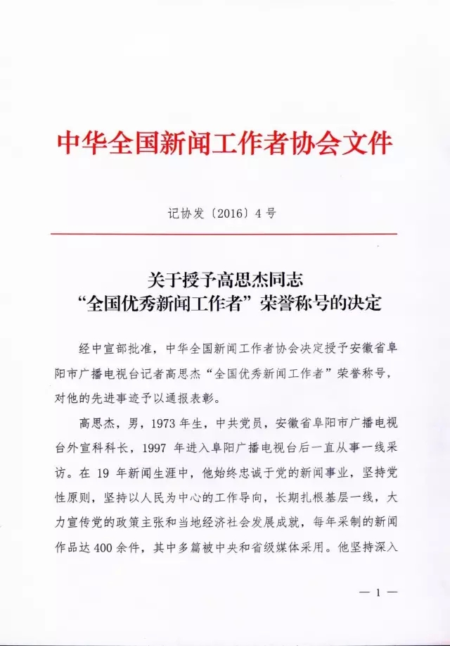 3月18日,中国记协在京召开座谈会,授予安徽省阜阳市广播电视台记者高思杰“全国优秀新闻工作者”荣誉称号,号召广大新闻舆论工作者学习他的先进事迹。