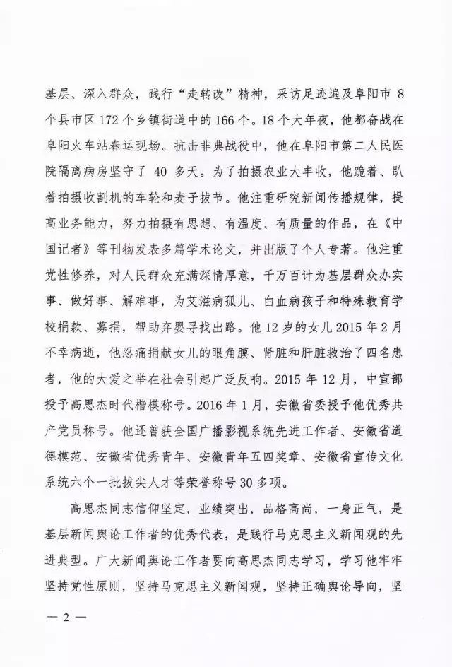 中国记协在表彰决定中说,高思杰同志信仰坚定,业绩突出,品格高尚,一身正气,是基层新闻舆论工作者的优秀代表,是践行马克思主义新闻观的先进典型。
