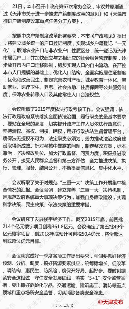 人民网北京3月22日电 据天津市人民政府新闻办公室官方微博消息,天津市审议并原则通过《天津市关于进一步推进户籍制度改革的意见》和《天津市推进户籍制度改革重点任务分工方案》。将建立城乡统一户口登记制度,实现城乡户籍登记“一元化”,取消农业户口与非农业户口性质区分,统一登记为天津市居民户口。