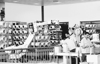 2015年,新苏伊士运河的开通拉动了埃及的制造业和基础设施建设。图为在北非最大的玻璃纤维制造企业埃及巨石公司,埃及员工与“机械手臂”一同生产的场景。王云松摄