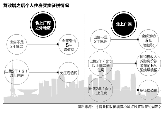 对北上广深而言,与上述政策唯一区分在于个人将购买2年以上(含2年)的非普通住房对外销售的,以销售收入减去购买住房价款后的差额按照5%的征收率缴纳增值税,而普通住房则免征增值税。