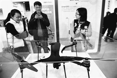 3月17日,多款高科技产品亮相浙江智慧城市博览会。图为参观者在观看采用全碳纤维设计的工业级监控无人机。