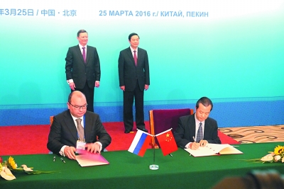 图为本届论坛上,在中共中央政治局委员、中央书记处书记、中宣部部长刘奇葆和俄罗斯总统办公厅主任伊万诺夫的见证下,光明日报社与俄罗斯塔斯社签署合作协议。记者 李曾骙摄