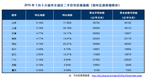 中国经济网记者注意到,根据对北京等十大城市主城区二手住宅的活跃样本调查,2016年3月,十大城市主城区二手住宅样本平均价格为32073元/平方米,环比上涨4.43%,同比上涨21.77%。