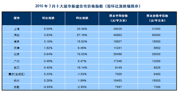 另一方面,根据百城价格指数对北京、上海等十大城市(新建)住宅的全样本调查数据,2016年3月十大城市住宅均价为21368元/平方米,环比上涨2.52%,涨幅较上月扩大2.01个百分点。