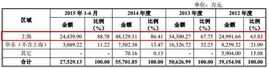 此外,据公司招股书显示,按地域划分,公司业务的主要市场集中在上海。2012—2015 年上半年上海区域的主营业务收入占比分别为 63.83%、67.75%、86.41%和 88.78%,占比呈上升趋势。华东区域(不含上海)和其他区域 2012—2015 年上半年的主营业务收入占比分别为36.17%、32.25%、13.60%和11.22%,占比有所下降。